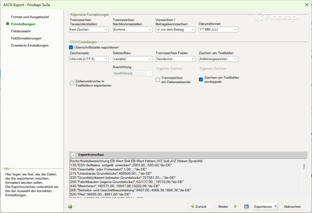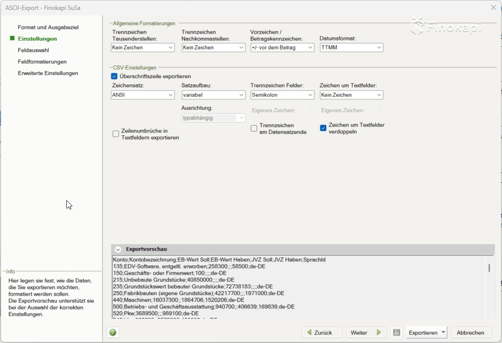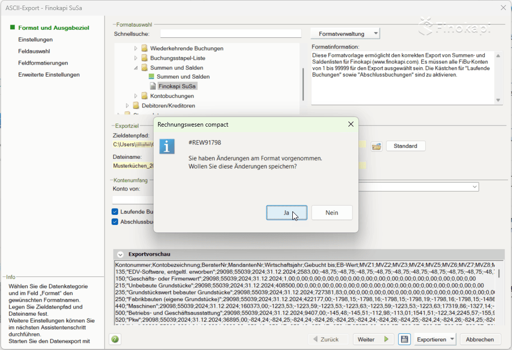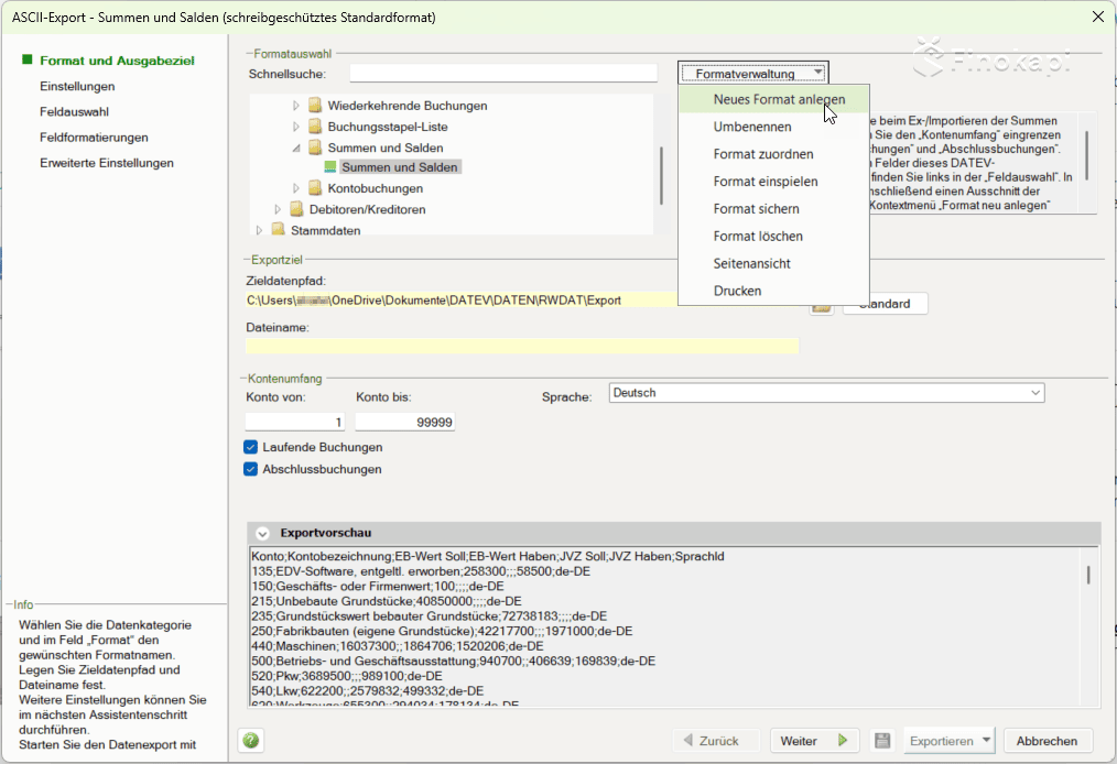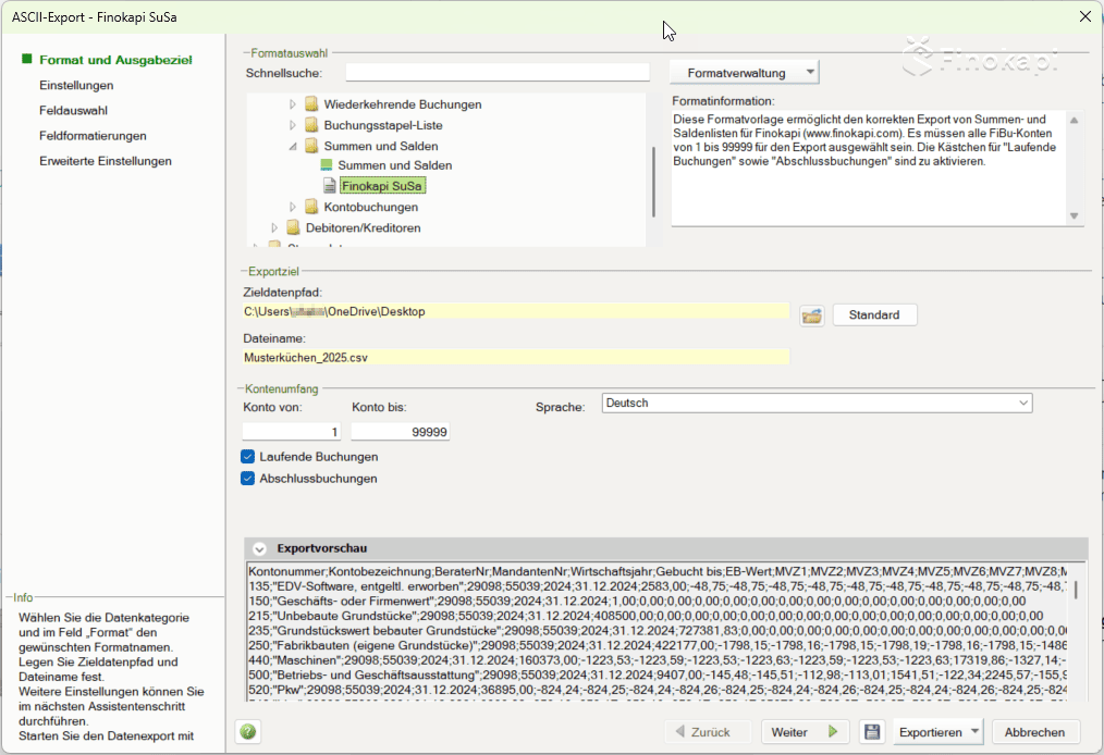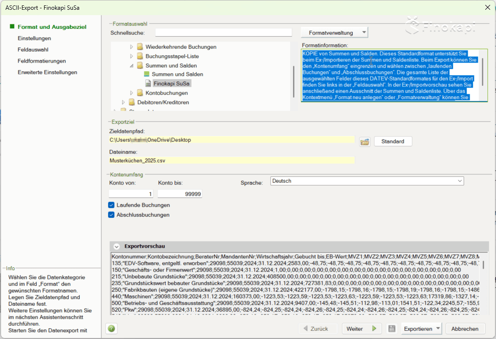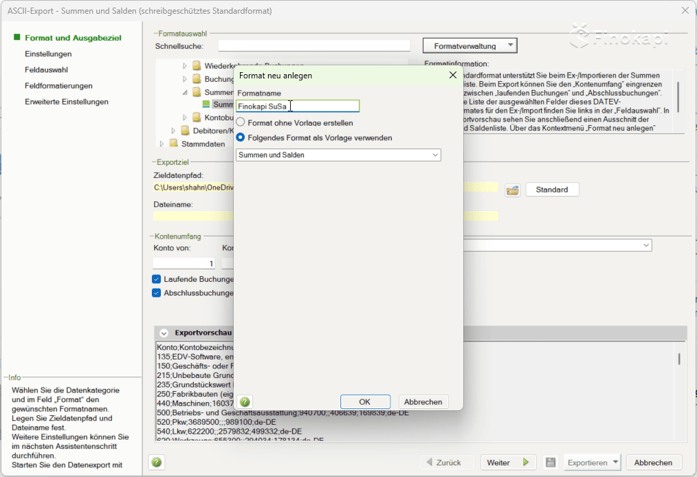 Klicken Sie links auf „Format und Ausgabeziel", um zur Übersicht zurückzukehren. Wählen Sie in der Formatauswahl unter „Summen und Salden" das Format „Finokapi SuSa" aus.