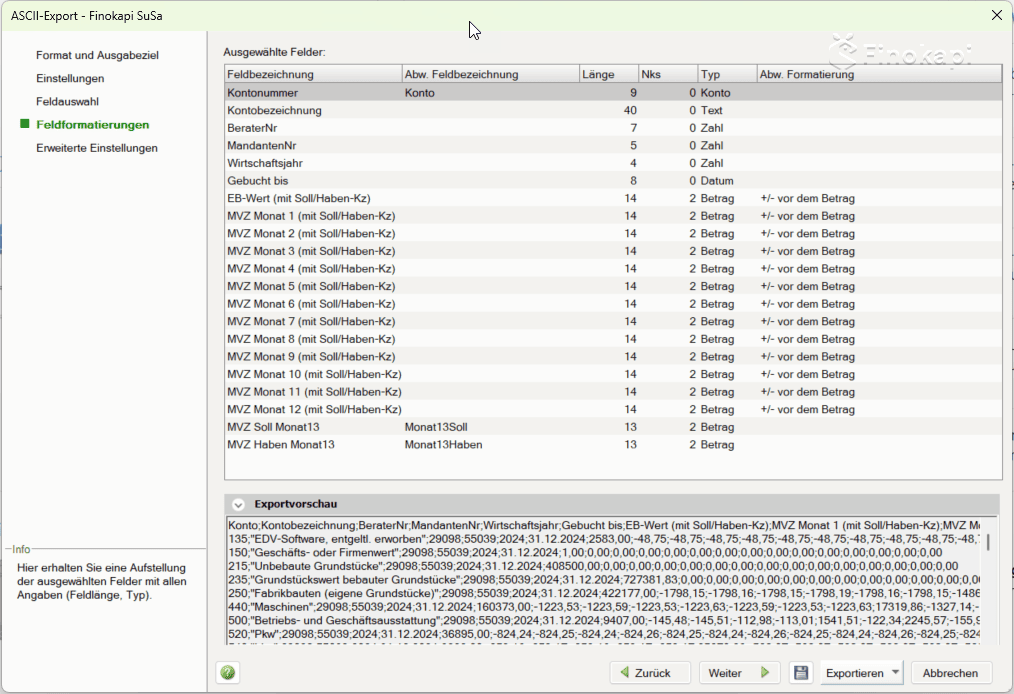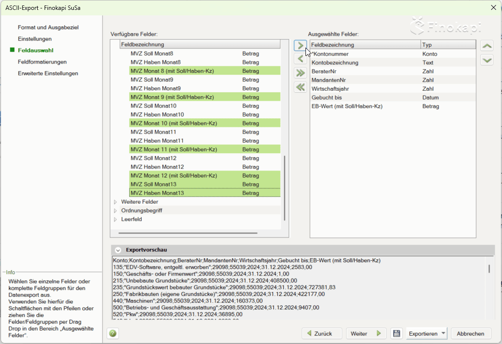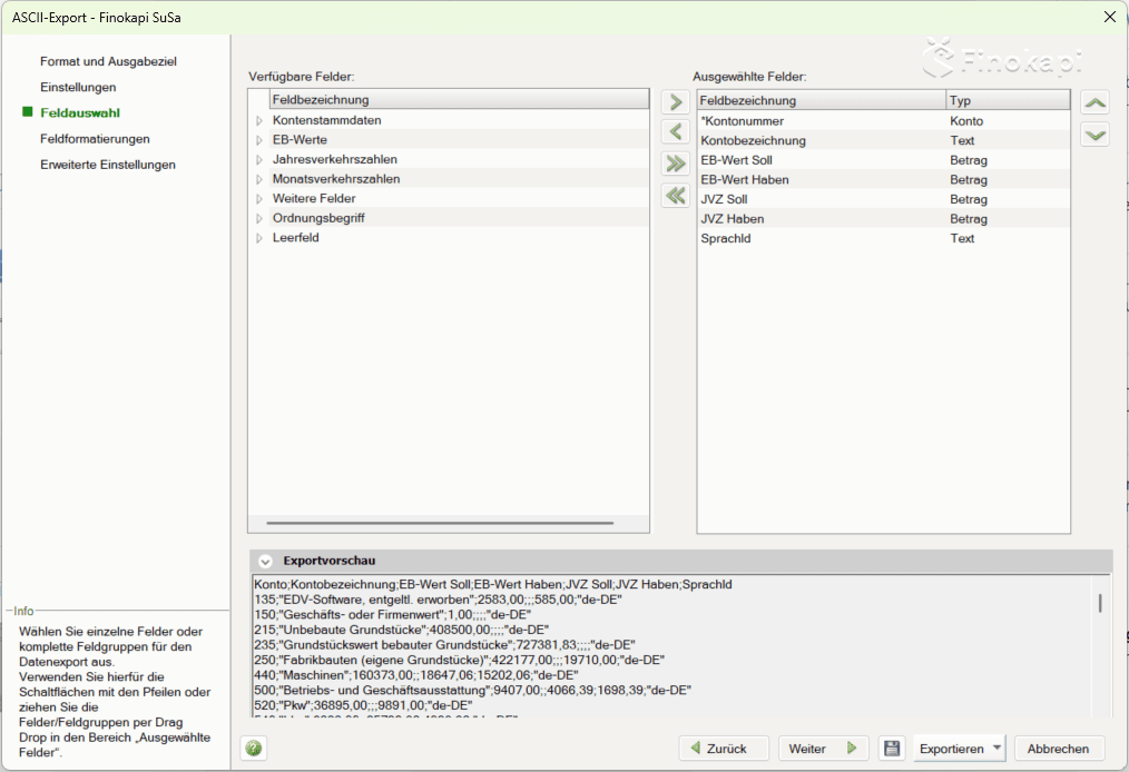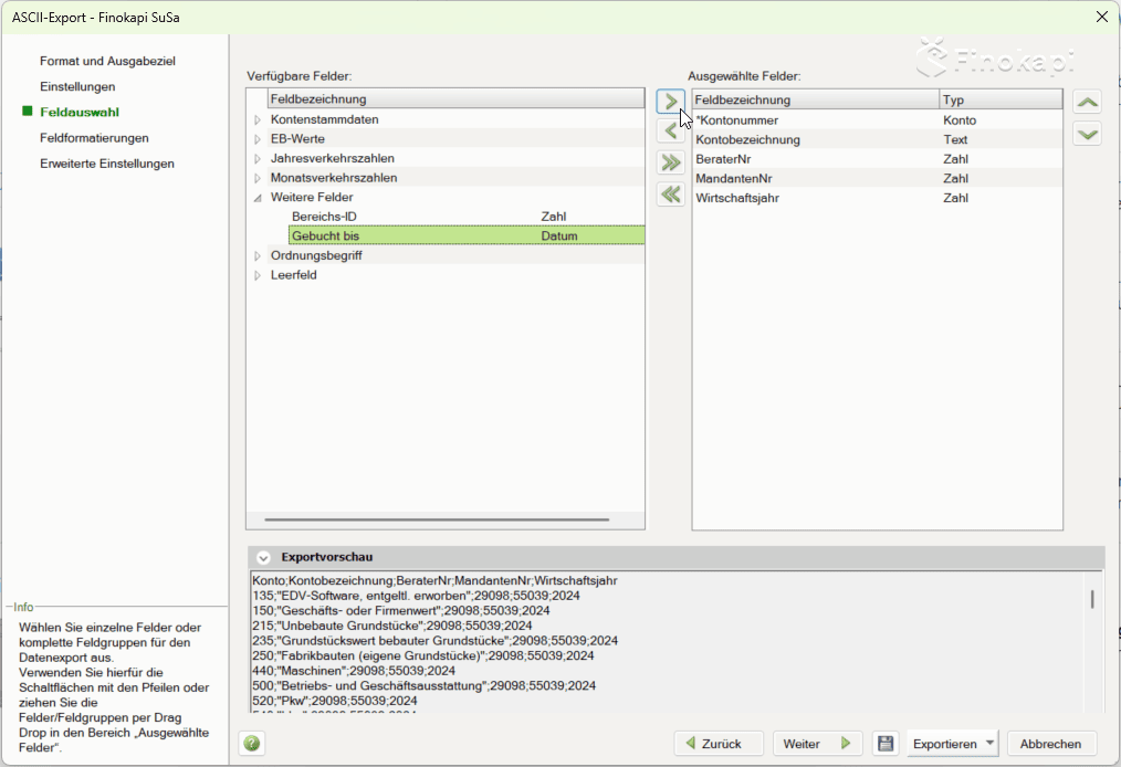 Klicken Sie links auf „Feldauswahl". In diesem Bereich legen Sie fest, welche Datenfelder in der Exportdatei enthalten sein sollen. Sie sehen links die verfügbaren Felder und rechts die aktuell ausgewählten Felder.