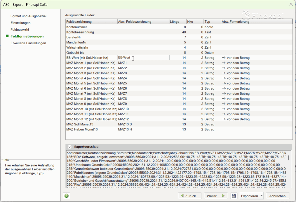 Diese Formatvorlage ermöglicht den korrekten Export von Summen- und Saldenlisten für Finokapi (www.finokapi.com). Es müssen alle FiBu-Konten von 1 bis 99999 für den Export ausgewählt sein. Die Kästchen für "Laufende Buchungen" sowie "Abschlussbuchungen" sind zu aktivieren.